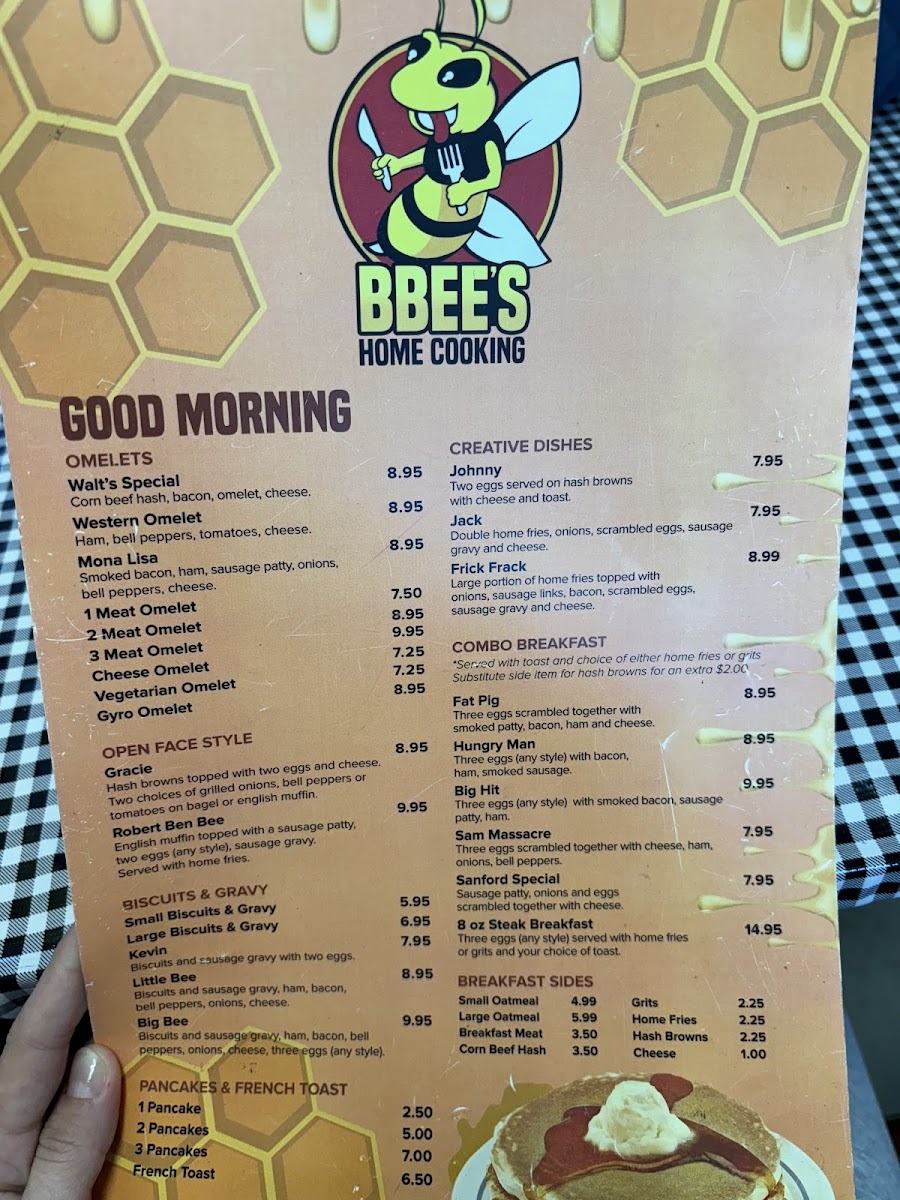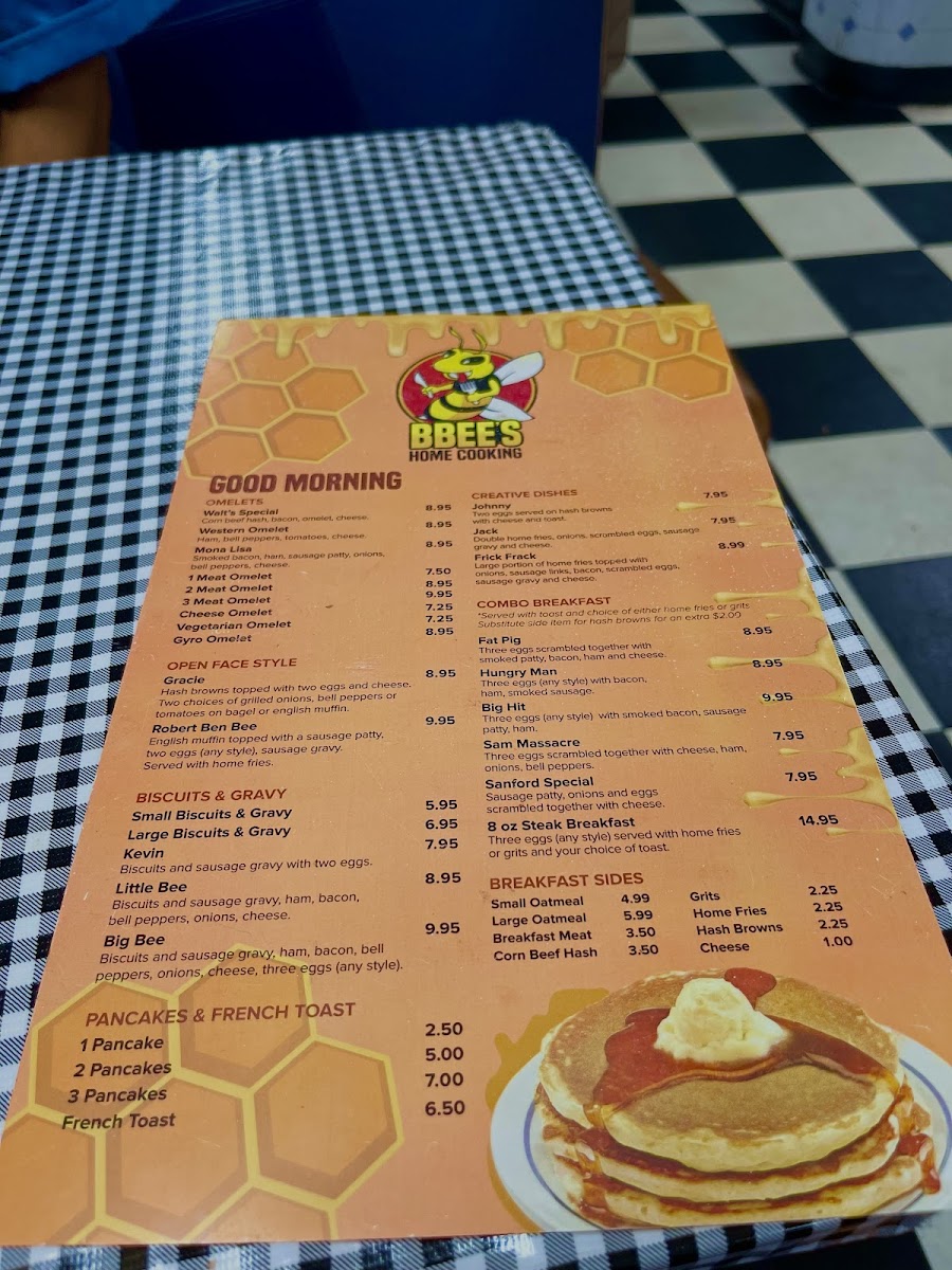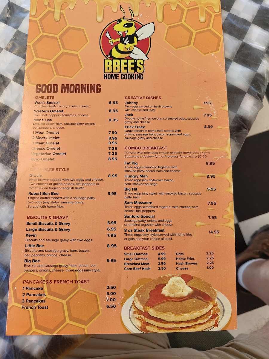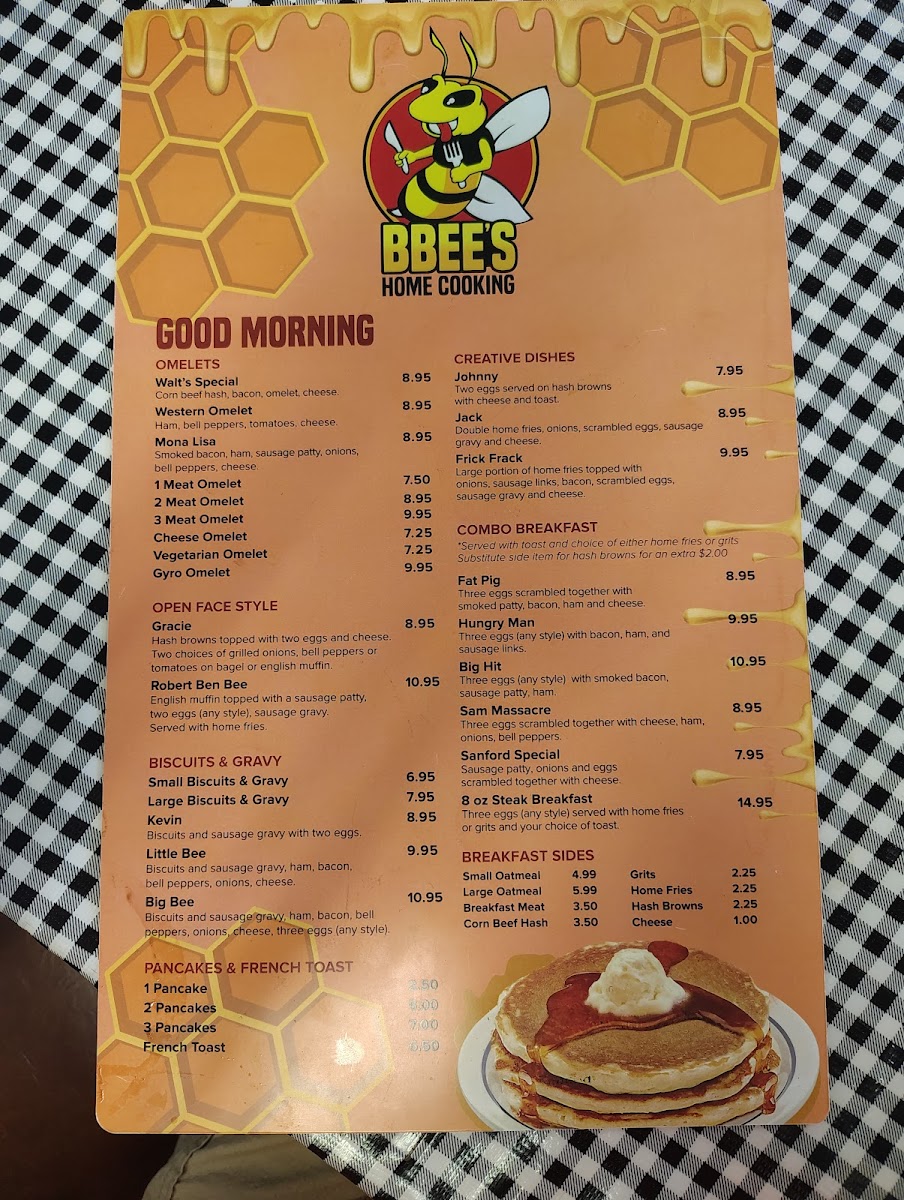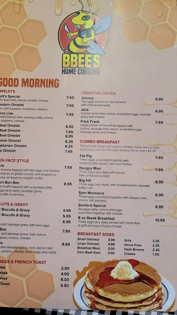 Steak and three eggs (any style). Served with toast and choice of home fries OR grits.